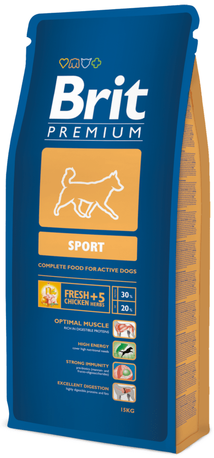 Pilnvērtīga sausā barība ar vistu, ļoti aktīviem suņiem Brit Premium Sport.